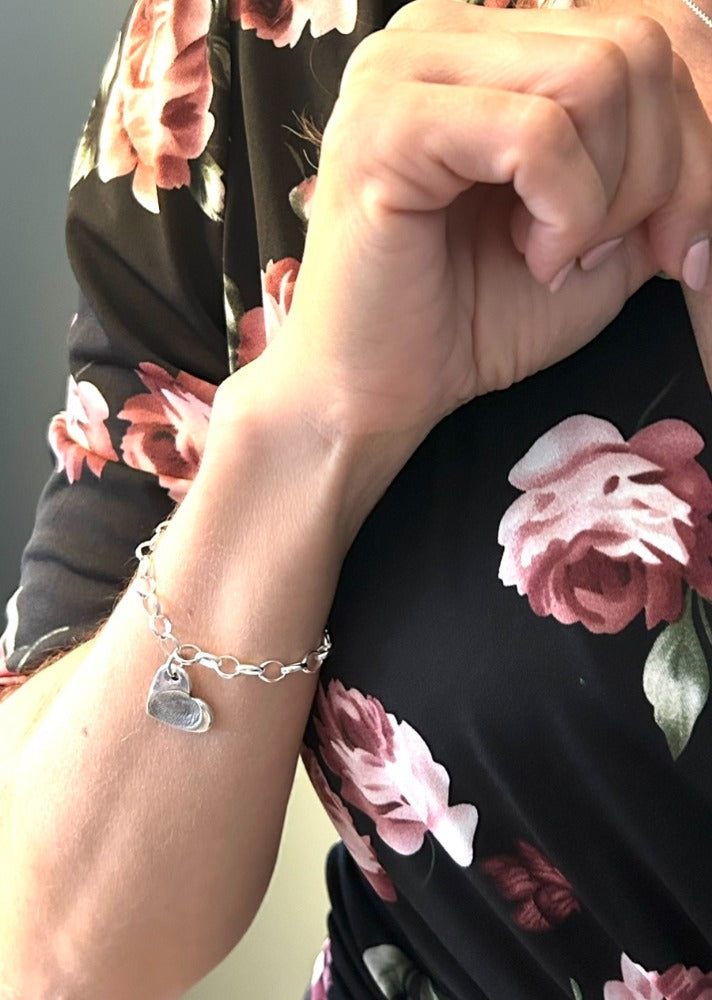 Each bespoke piece is permanently embedded with the individual fingerprint, making it a one of a kind. The pendant is available in a heart, circle, square or hexagonal shape and comes on a sterling silver 5mm belcher chain. The bracelet length is 7.5"/19cm.