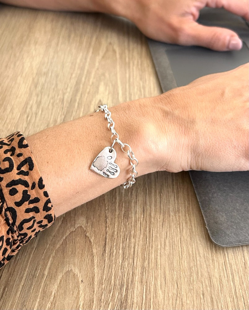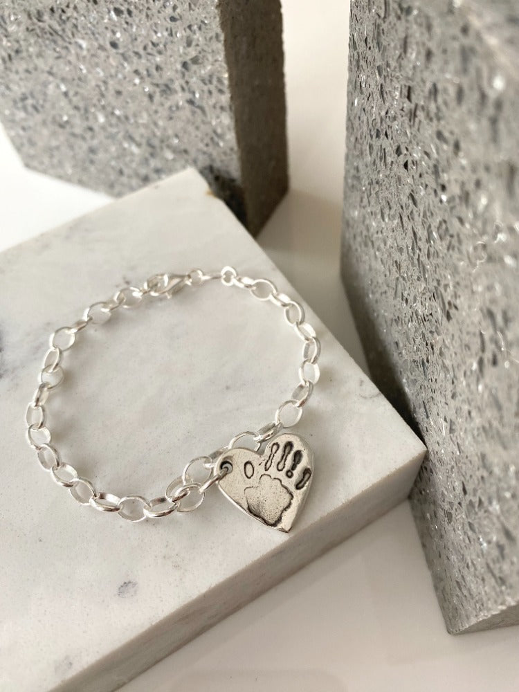 The unique print is then captured in fine silver 999 which is hallmarked by the London Assay Office. This pendant is available in a choice of heart, circle, hexagonal and square shapes and comes with on a sterling silver 5mm belcher chain. The bracelet length is 7.5"/19cm.