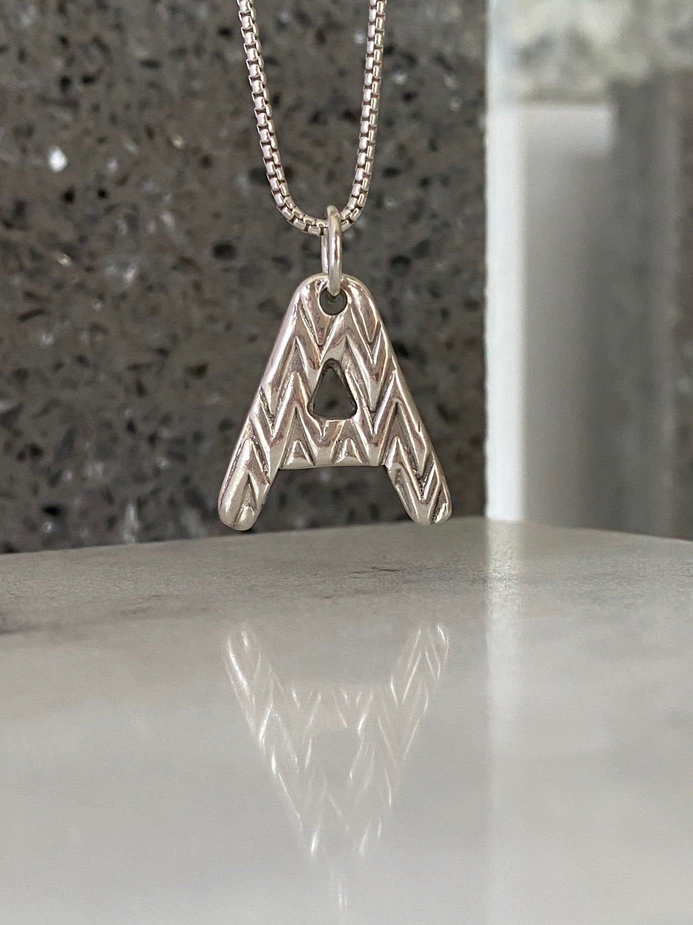One of our most popular, eye-catching pieces these timeless initial necklaces have a zigzag pattern, textured finish and are hand crafted from solid fine silver 999. They are hallmarked by the London Assay Office. Each pendant sits on a 1.3mm sterling silver box chain in either 16" or 18" length.
