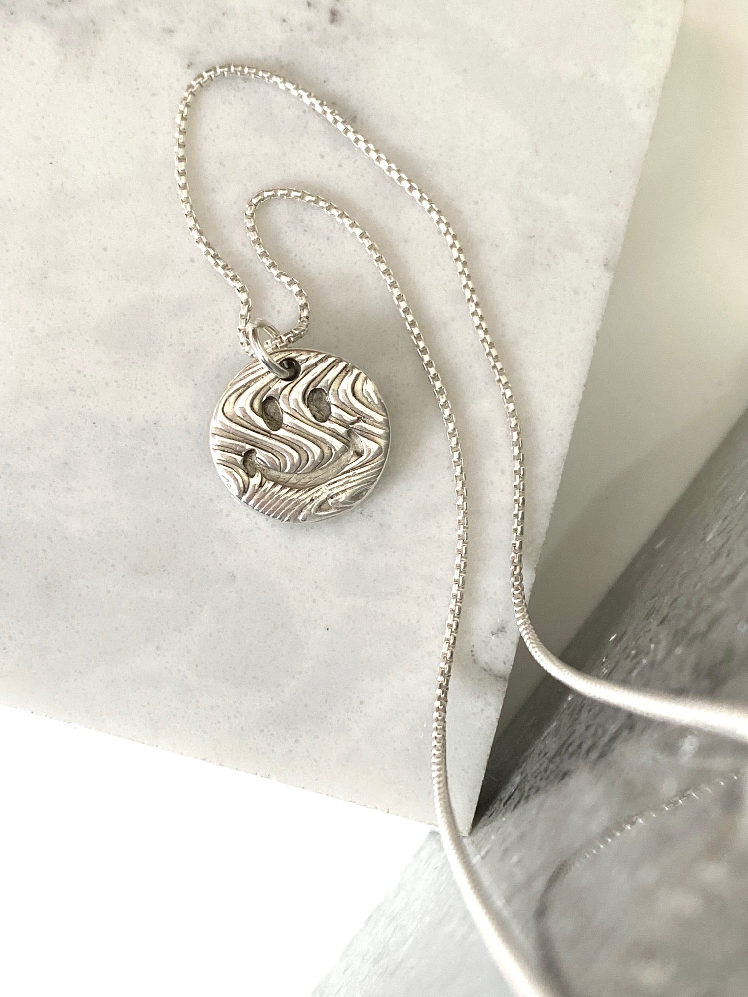 The smiley face is embedded in a shiny, psychedelic texture handmade from pure, fine silver 999. This is hallmarked by the London Assay Office.